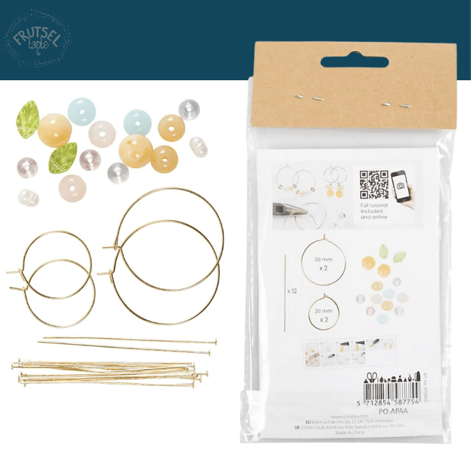 Deze set bevat rocailles, glaskralen, oorringen, nietstiften en een uitleg hoe je deze prachtige oorbellen kan maken. Er is ook een QR code op de doos om de uitleg digitaal te krijgen.