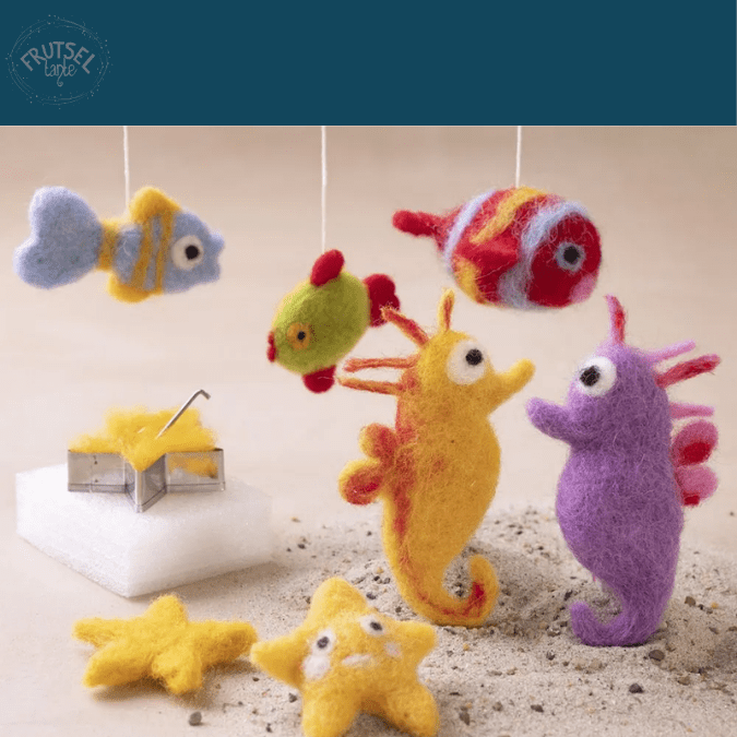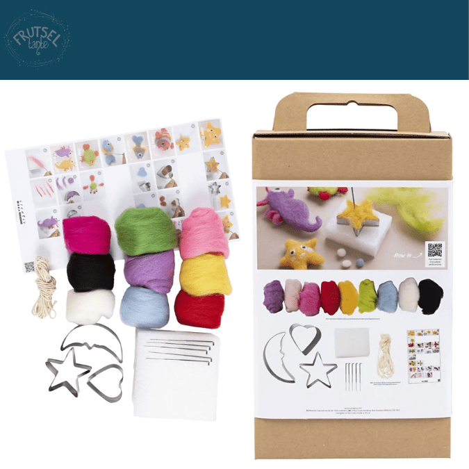 Deze schattige onderwaterdieren van vilt kan je zelf maken met gekaarde wol. De set bevat wol, naalden, een houder, viltkussen, sjablonen en een uitleg. Scan de QR code voor een digitale uitleg. Maak met de sjablonen een hart, ster en maan en vanuit daar kan je de leuke dieren maken.