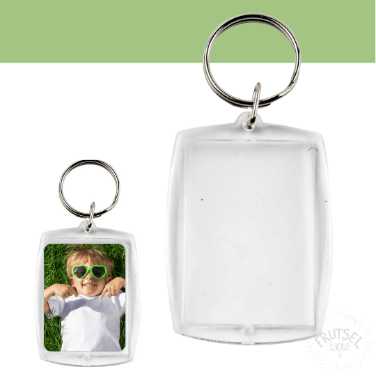 Sleutelhanger van transparant acryl – met sleuf om tekeningen, foto’s etc in te doen.