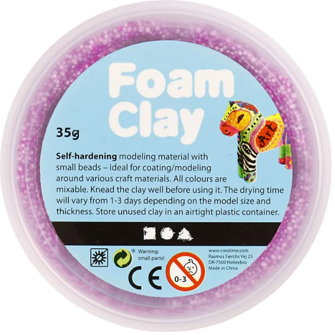 Foam Clay is een zelf hardende klei. Het bestaat uit kleine balletjes die met een soort lijm en kleurstof zijn gemengd. Mensen die niet de naam kennen, noemen het vaak balletjes klei. De Foam Clay is dus een boetseermateriaal wat een beetje plakkerig os, zodat je ondergronden kan versieren/decoreren. Daarentegen plakt het niet tot nauwelijks aan de handen. Ook geeft het niet af (met uitzondering van de metallic kleuren).
