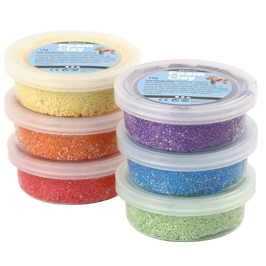Deze Foam Clay metallic set met kleine potjes in een koker heeft de kleuren rood, geel, blauw, groen, paars en oranje. Foam klei is een zelf hardende klei en bestaat uit kleine styropor balletjes die met een lijm en kleurstof zijn gemengd. Perfect om leuke ondergronden van verschillende materialen mee te decoreren. Je kan er ook leuke foam klei figuren van te maken. De klei plakt niet tot nauwelijks aan je handen.