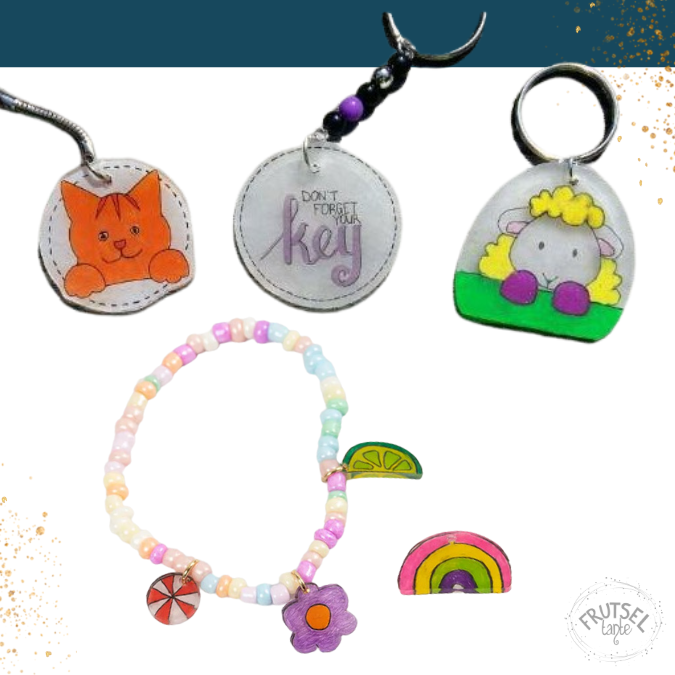 Op het krimpfolie kan je met permanente markers en andere soorten markers en soms ook kleurpotloden tekenen en inkleuren. Knip het daarna uit en maak er eventueel een gaatje in (met een tang of perforator). Daarna kan je het krimpen in een voorverwarmde oven van tussen de 140 -170°C. Kijk op de verpakking welke temperatuur bij jouw krimpfolie past. Binnen een paar telen krult het op en wordt het weer plat. Haal het dan uit de oven en laat het nog even afkoelen. Eventueel onder een zware glazen schaal.