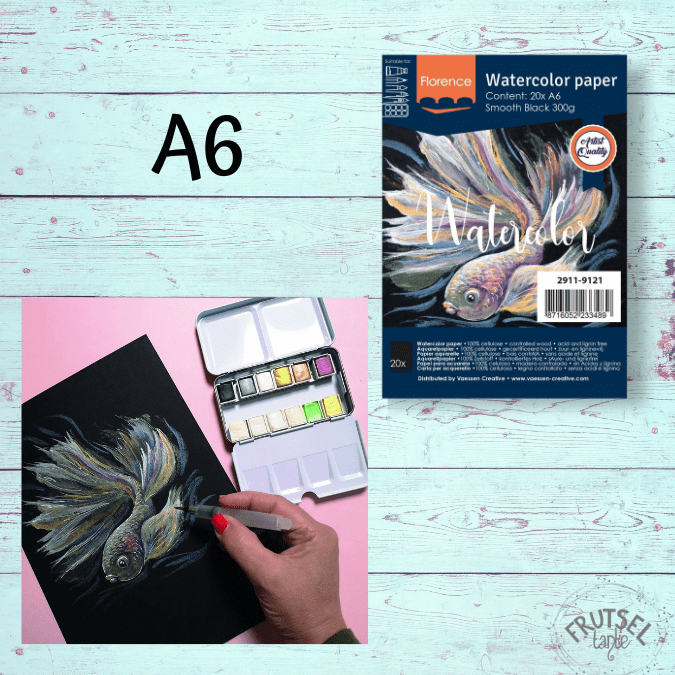 20 losse vellen met glad zwart aquarelpapier 300 grams in A6-formaat. Dit papier heeft een mooie prijs-kwaliteitverhouding. Geschikt voor aquarelverf en Brushpennen (met name metallic kleuren). Door het gladde oppervlak ook zeer fijn om op te tekenen en te handletteren.