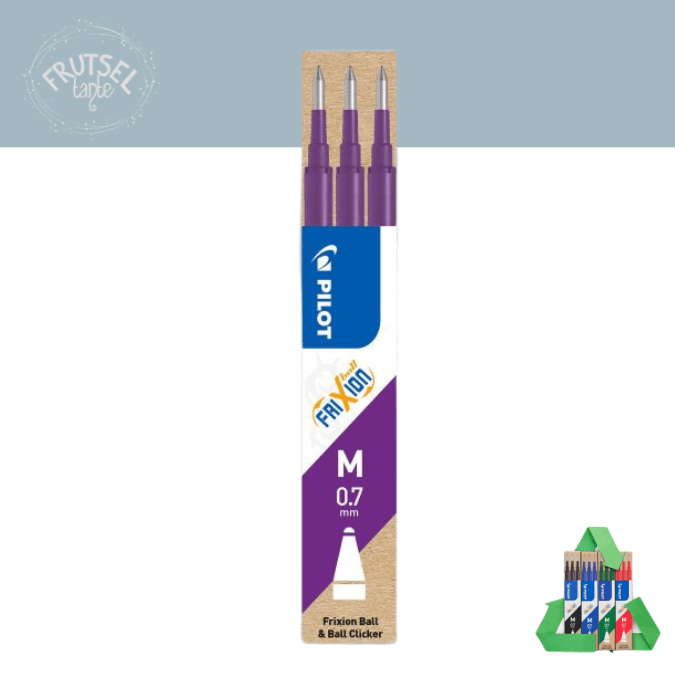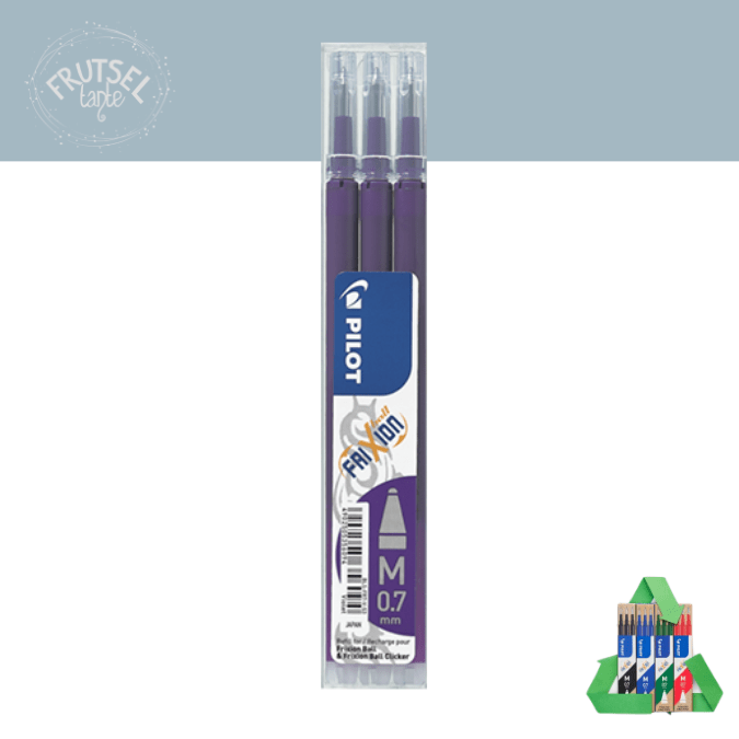 Deze navulling met violet uitwisbare inkt met een punt van 0,7 mm past in de Pilot FriXion balpennen. In dit doosje zitten 3 navullingen. Door het navullen verminder je het plastic afval en het is voordeliger dan een nieuwe pen.