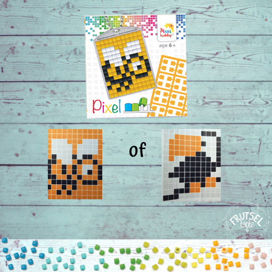Maak ook deze leuke sleutelhanger set. Deze pixelhobby set bestaat uit 1 doorzichtig medaillon (3 x 4 cm), 1 kettinkje, 3 gekleurde pixelmatjes met pixels van 2 x 2 mm en een patroon.