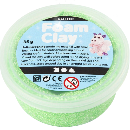 Deze foam klei is neon-groen gemengd met glitter. Deze kleur is ook zonder glitter te verkrijgen. Foam klei is een zelf hardende klei en bestaat uit kleine styropor balletjes die met een lijm en kleurstof zijn gemengd. Perfect om leuke ondergronden van verschillende materialen mee te decoreren. Je kan er ook leuke foam klei figuren van te maken. De klei plakt niet tot nauwelijks aan je handen.