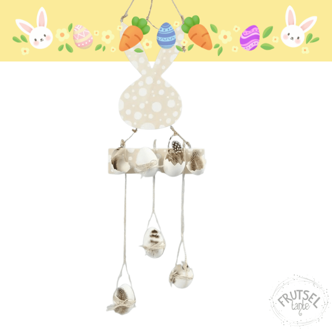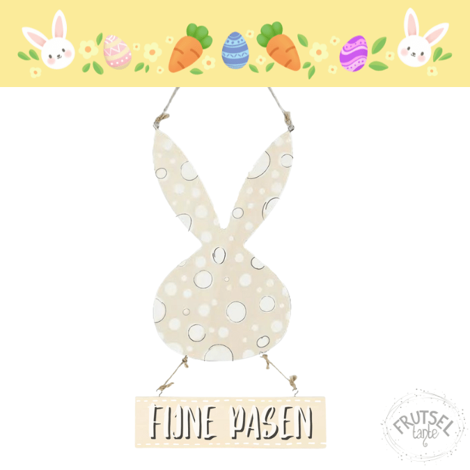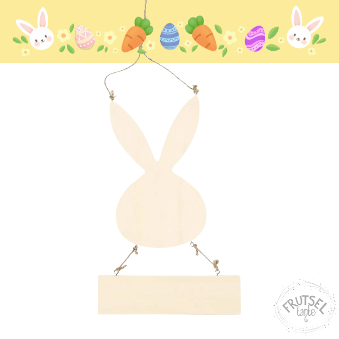 Dit leuke konijn van triplex met een bordje er onder is leuk als deurhanger of voor aan de muur. De hanger heeft een koord van jute. De hoogte is 29,5 cm en het is 19,2 cm breed.